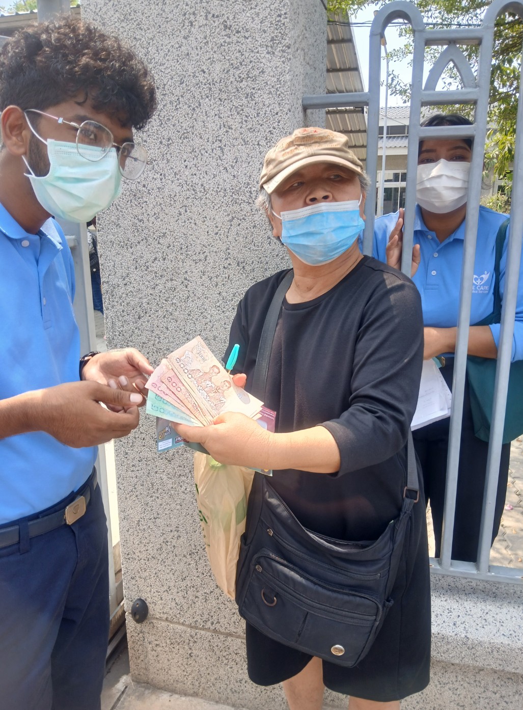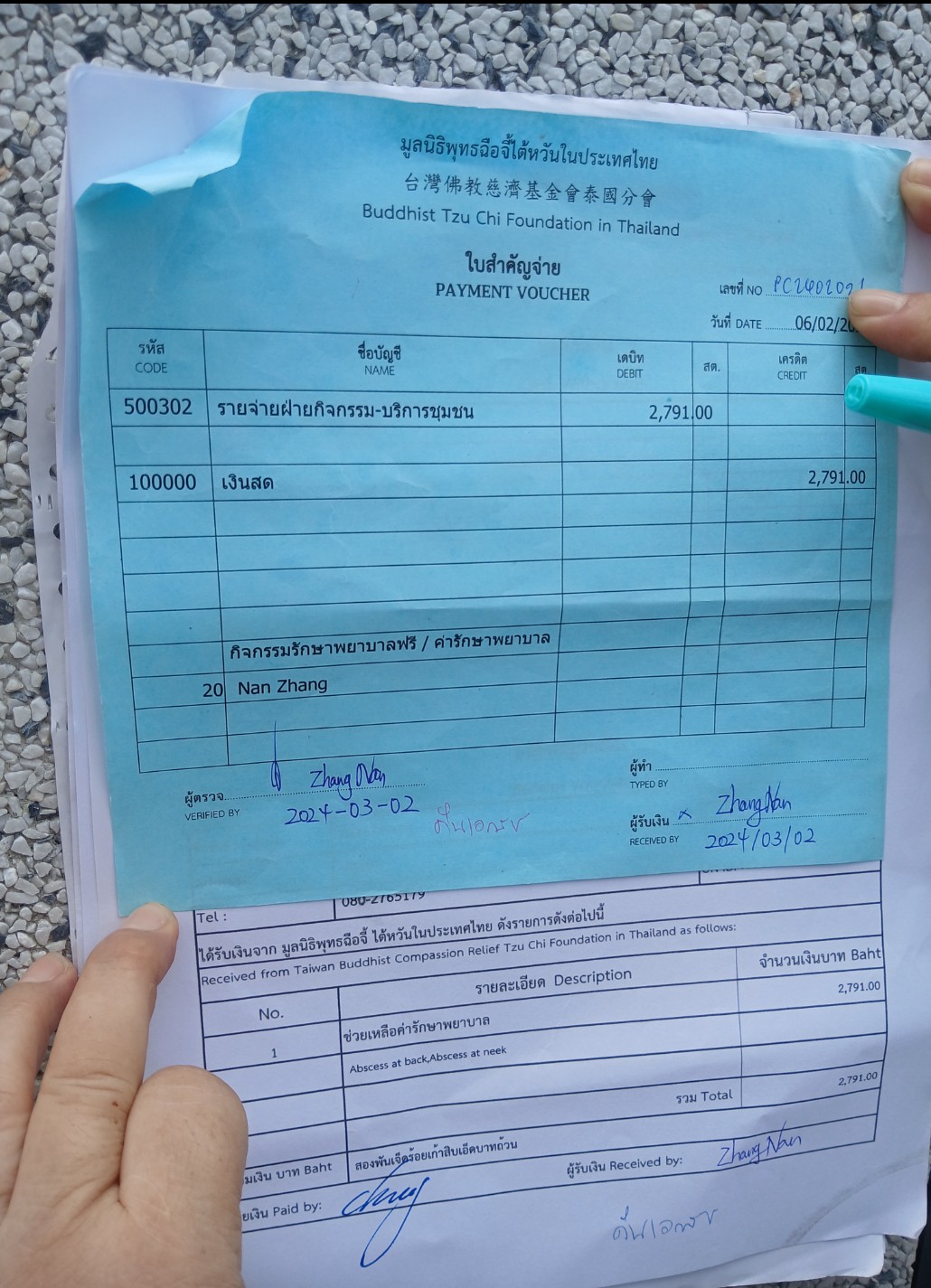 3月2日我来慈济看病以及我再一次去泰国慈济分会去要慈济给我女儿做手术报销的两张账单2791泰铢,而且慈济领导说:“你手术费用的两张账单已经给报销了,但是为什么报销钱不给我们?”我们到慈济,慈济的保安电门关上不让我们进去,我说:“我来看病,”慈济的保安请示后说:“领导说不让你进去”,我说:“我来领手术报销的两张账单2791泰铢”,慈济的保安请示后说:“让我们等一下,”这时,泰国慈济的领导出来嘱咐保安,我叫她并说:“你有什权利不让我们进慈济,你说给我们报销了手术两张账单2791泰铢,为什么至今不给我,都被你们贪了吗”,泰国慈济的领导一边走一边说:“这点钱,我还不放在眼里”保安还威胁我们说:“领导说了,你们不走就找警察把你们抓起来,让你们与当局失去联系,”我说:“还威胁我们,我是来领手术报销的两张账单2791泰铢”,慈济保安说:“你需要等待一下,”我们等了一个多小时,来了4个人还有一个给我们拍照,我女儿签名,签完名,给我们2791泰铢,还让我们对镜头拍照,拍照是证明你手术的两张账单报销钱给我们了;我也要拍照,因为只给我报销手术的两张账单共2791泰铢,八张换药清洗伤口的账单共1038泰铢没有给我报销,避免慈济的领导说都给我们报销了,我也要留证据。(附图片)